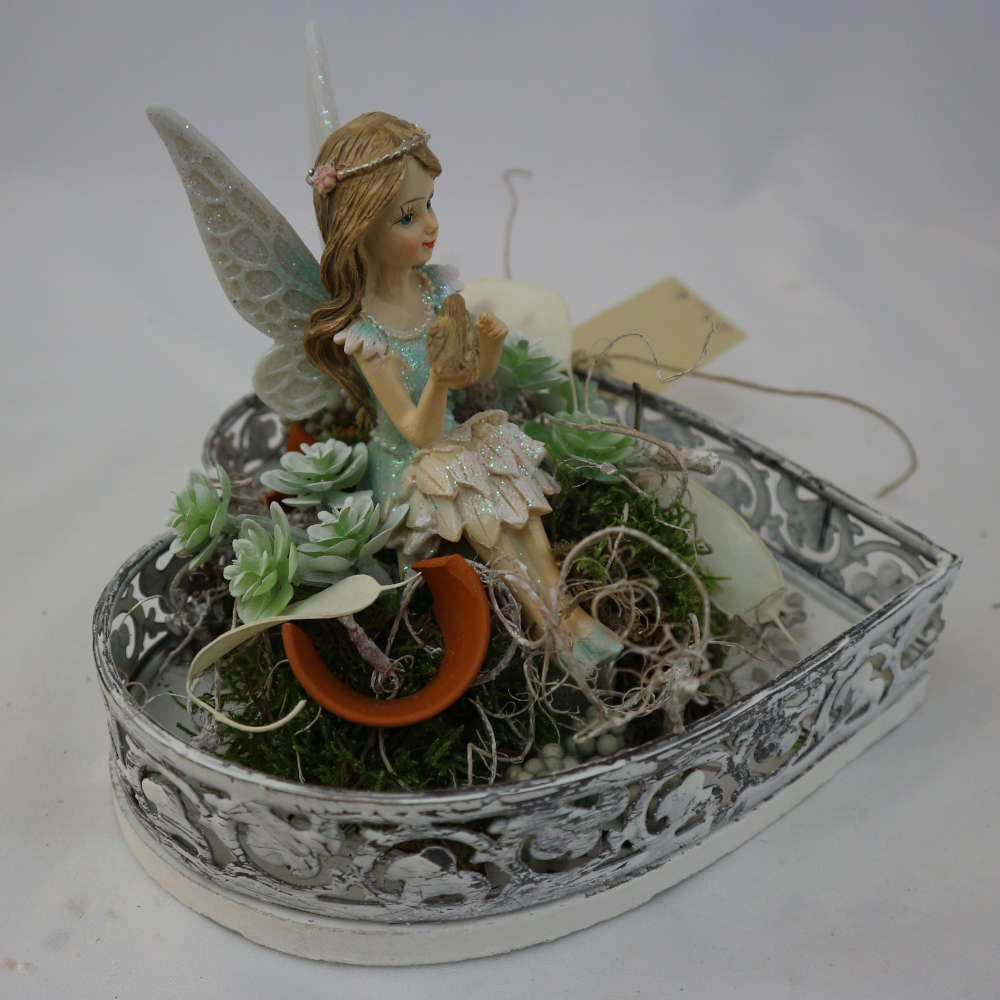 Auf einem kleinen, weißen Herztablett; welches mit Moos gepolstert wurde, sitzt eine kleine Elfenfigur im mintgrünen Kleid. Auf ihrer geöffneten Hand sitzt ein kleiner Spatz. Sie wird von Seidenblumen, u.a. Sukkulenten und grünen Beeren, flankiert. Kleine Tontöpfe wurde verspielt mit eingearbeitet.